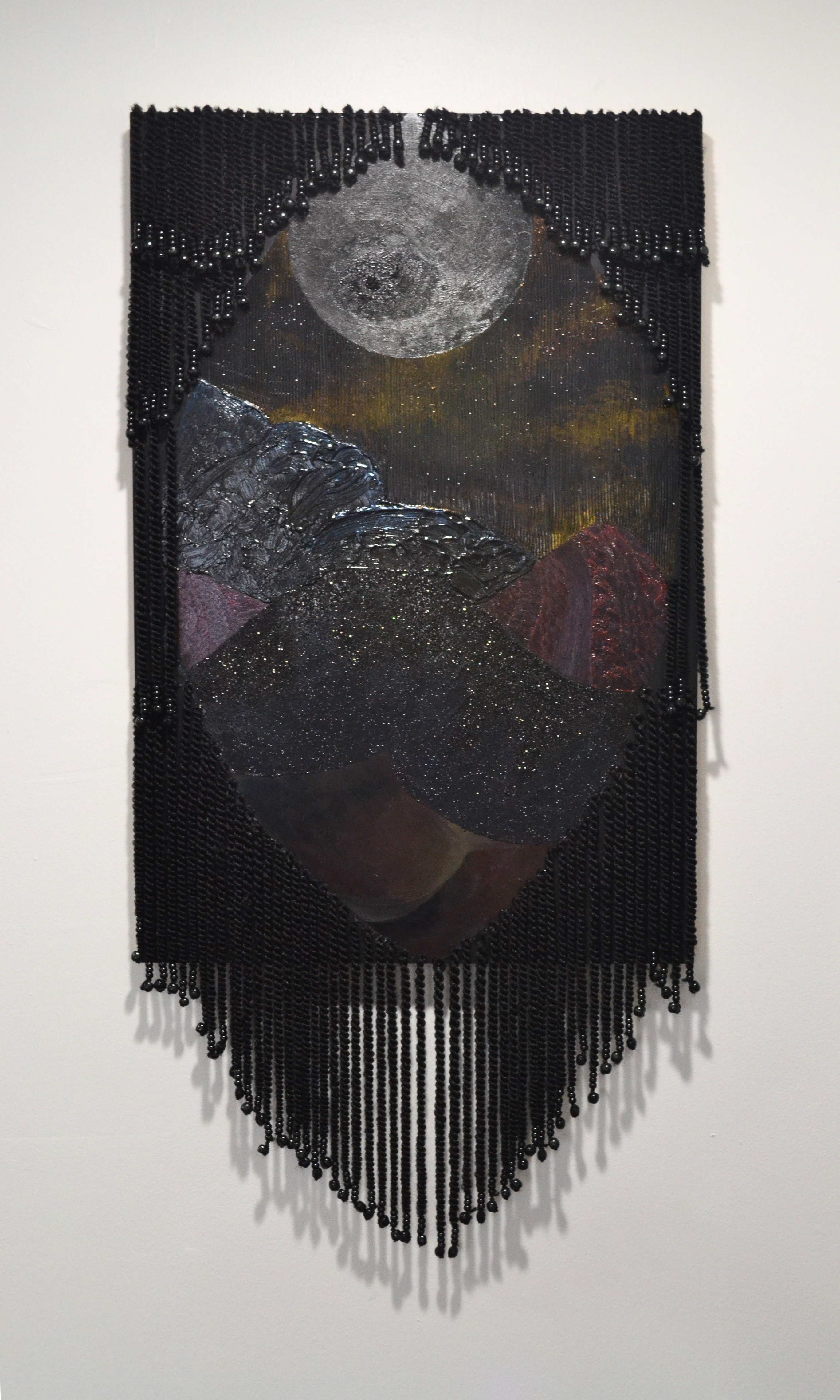 Acrylic Paint, Synthetic Hair, Glitter, Beads, and Rubber Bands on Panel