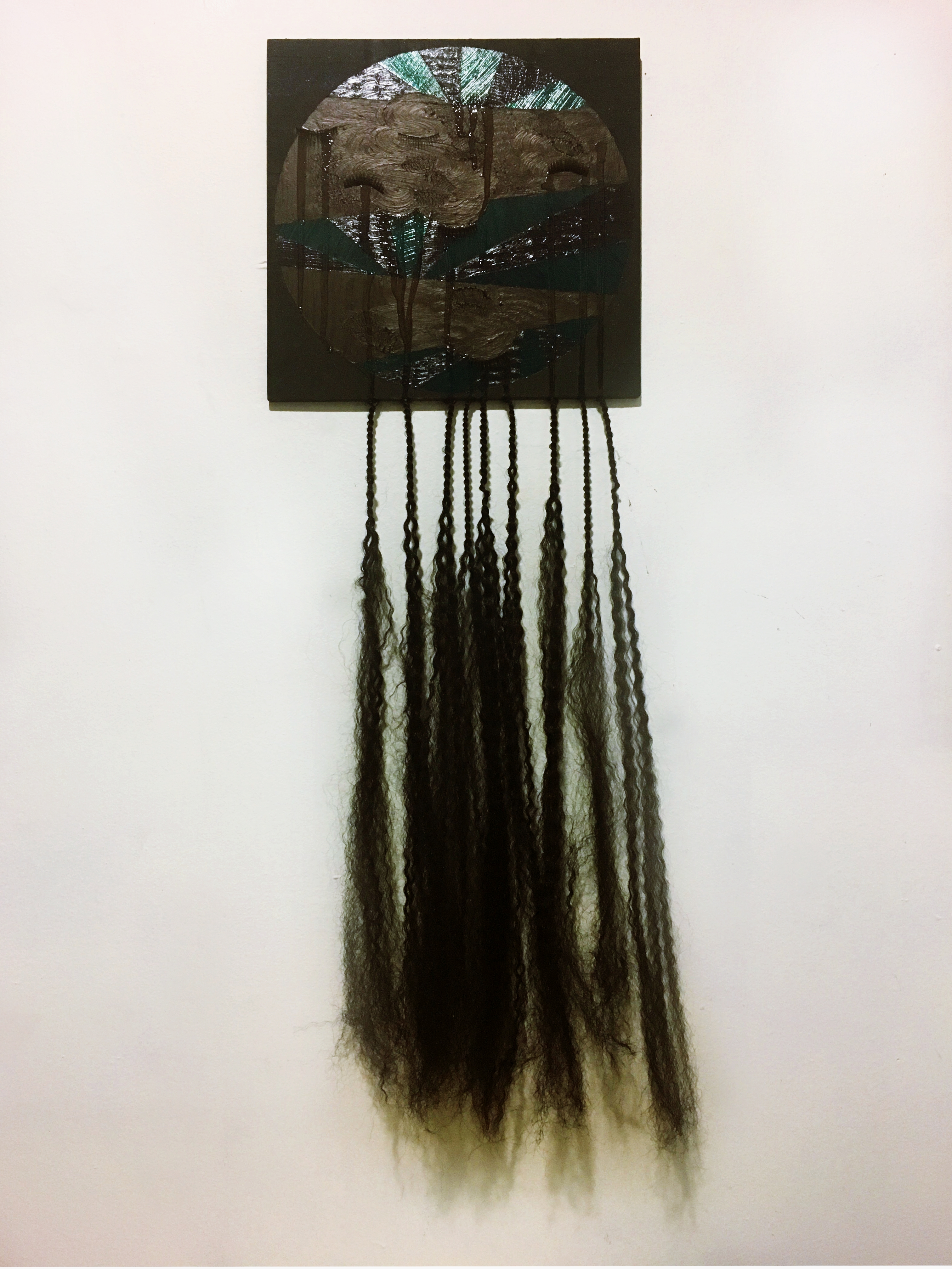 Acrylic Paint, Glitter, Kanekalon Braid Hair, Glass Glitter, and Powdered Tire Rubber on Canvas (no frame)