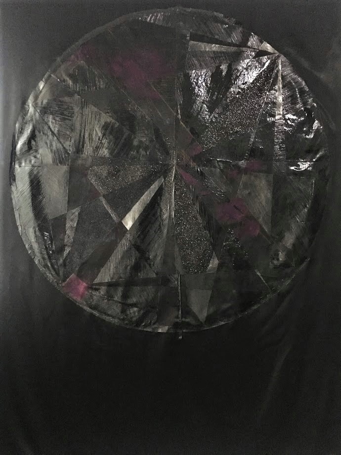 Acrylic Paint, Glitter, Holographic Paint, and Masking Tape on Satin